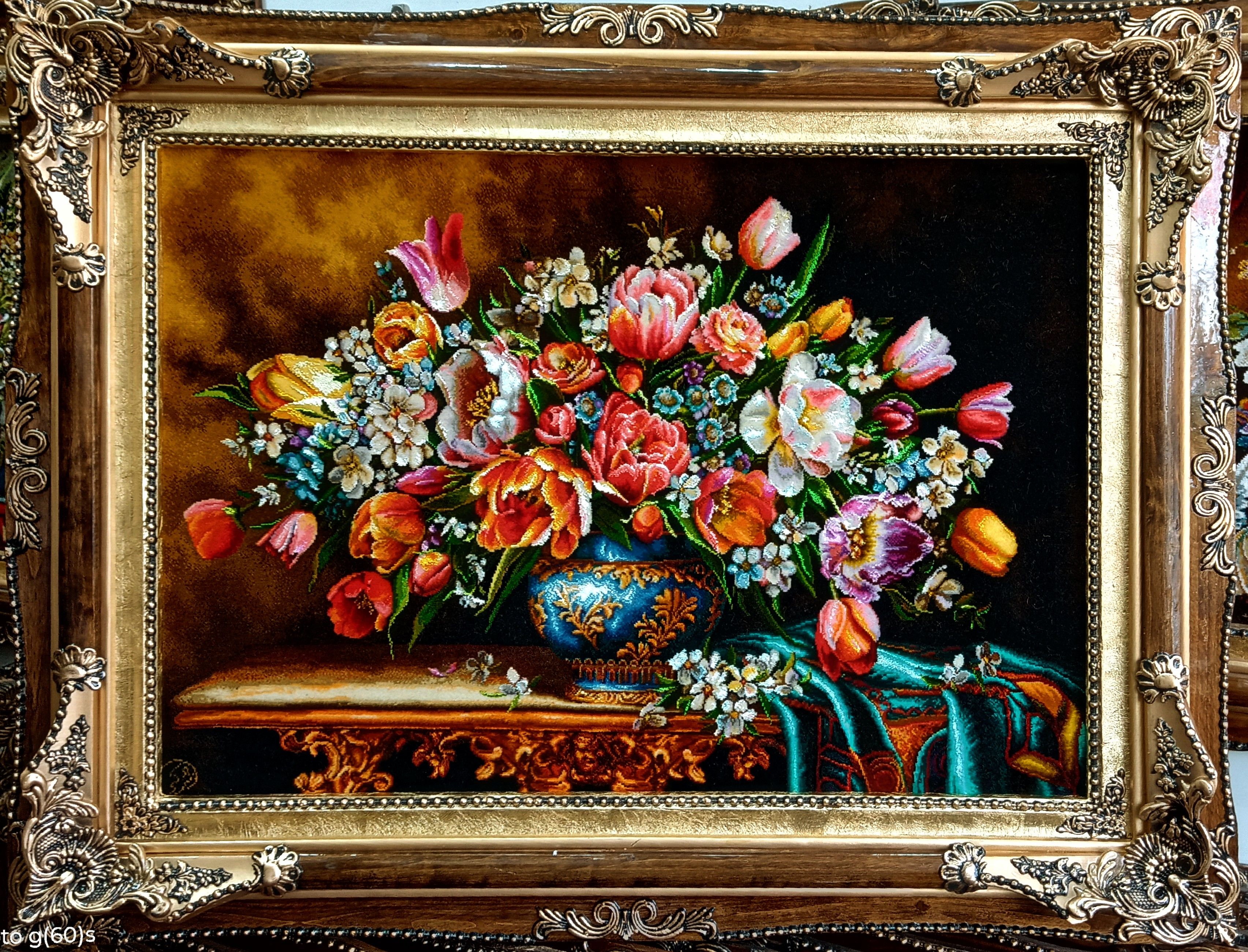 تابلو فرش دستبافت گل و گلدان مسی علی نواز